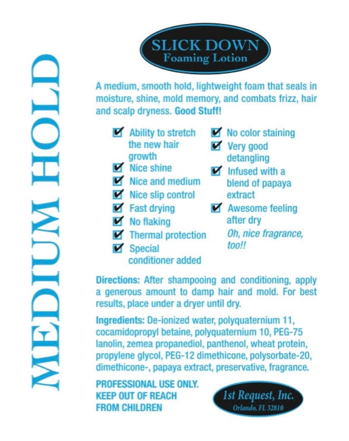 Experience smooth, flexible, and frizz-free styling with Slick Down Foaming Lotion. This lightweight foaming lotion delivers a medium, smooth hold while locking in moisture, shine, and mold memory, all while combating frizz, dryness, and scalp irritation. It’s everything you need for flawless styling — Good Stuff!